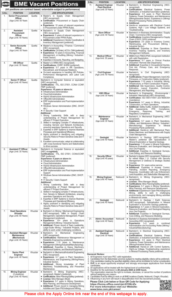 Bolan Mining Enterprises (BME) has announced latest Bolan Mining Enterprises Jobs 2026 for qualified, experienced, and skilled professionals. According to an advertisement published in the Daily Dawn Newspaper on Sunday, 04 January 2026, applications are invited for a wide range of technical, engineering, IT, accounts, medical, and administrative positions.