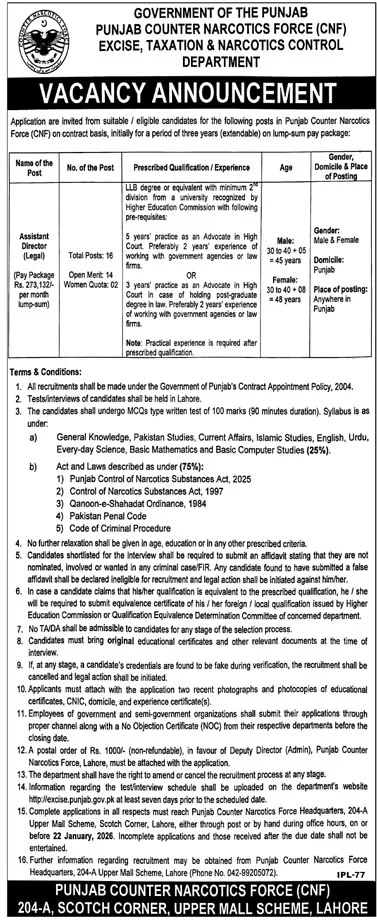 Punjab Counter Narcotics Force (CNF), working under the Excise, Taxation & Narcotics Control Department, Government of the Punjab, has announced new government job opportunities under Punjab Counter Narcotics Force Jobs 2026. According to the advertisement published in the Daily Express Newspaper on 09 January 2026, applications are invited for the post of Assistant Director (Legal) on a contract basis.